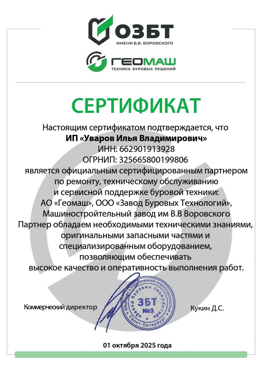 УралБурРемонт (ИП Уваров И.В.) - официальный партнер ГК Геомаш и ОЗБТ им В.В. Воровского в Уральском ФО по ремонту и сервисному обслуживанию буровых установок производства ОЗБТ им В.В. Воровского и Геомаш: УРБ-2А2, УРБ-2Д3, ПБУ-2, УГБ, УРБ-25, УРБ-210 и других моделей.